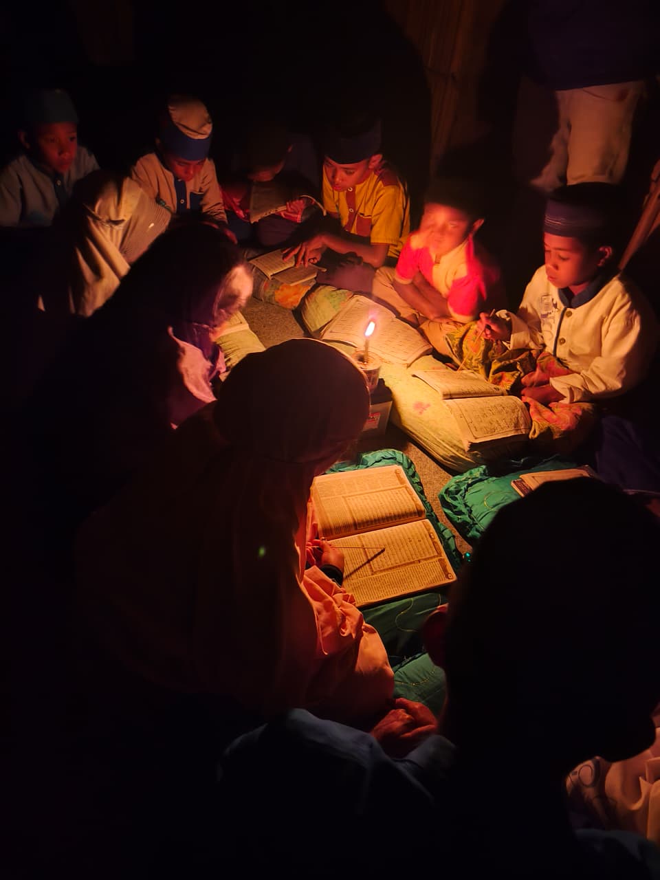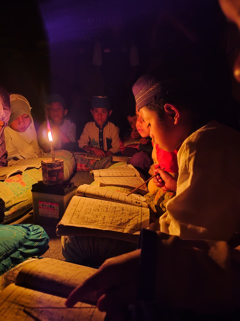 Di sudut pelosok yang belum terjamah listrik, para santri ini membuktikan bahwa semangat belajar tak boleh padam meski hanya diterangi sebatang lilin. Di atas alas sederhana, mereka melantunkan ayat suci dalam temaram, berjuang melawan pekatnya malam demi masa depan yang lebih terang.